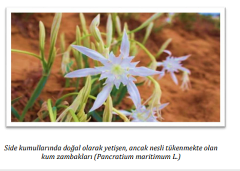 Side Antik Kenti ve çevresi, ekolojik özellikleri bakımından da oldukça zengin olmasıyla misafirlerin beğenisini kazanmaktadır. Örneğin, Akdeniz kıyılarında yaşayan ve her yıl yaz aylarında Side sahillerini de yumurta bırakmak için tercih eden deniz kaplumbağaları (Caretta caretta L.), sahilde yürüyüş yapan misafirlere unutulmaz anlar yaşatmaktadır. Bitki örtüsü açısından, özellikle zeytin, defne ve badem ağaçları kente mal olmuş durumdadır. Dünyada sadece Side’de yayılış gösteren endemik Side Canavar Otu (Orobanche sideana Gilli) antik kentte, kumul alanda yetişmektedir. Side kumullarında doğal olarak yetişen ve nesli tükenmekte olduğundan dikkatleri üzerine toplayan bir diğer bitki türü de kum zambaklarıdır (Pancratium maritimum L.).